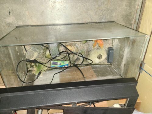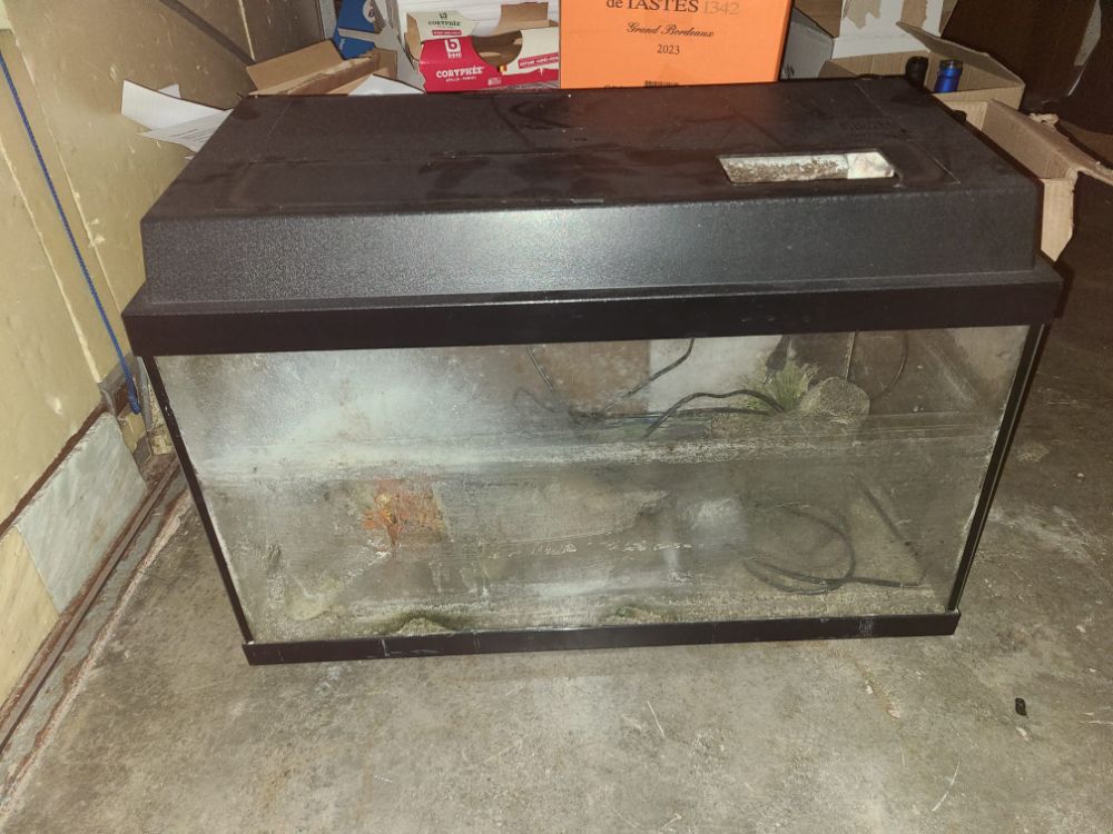 Aquarium 50l à nettoyer mais fonctionnel avec pompe, brosse de nettoyage des vitres et quelques decorations