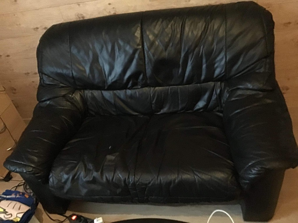 Canapé 2 places en cuir noir avec une très petite tâche d’usure sur l’assise droite. Dimensions 135X75 cm