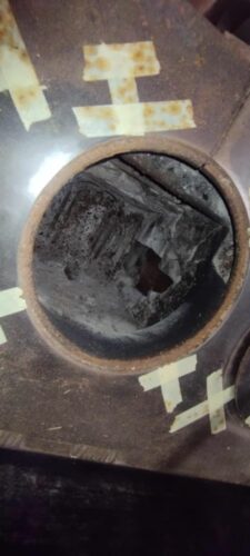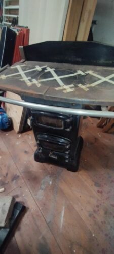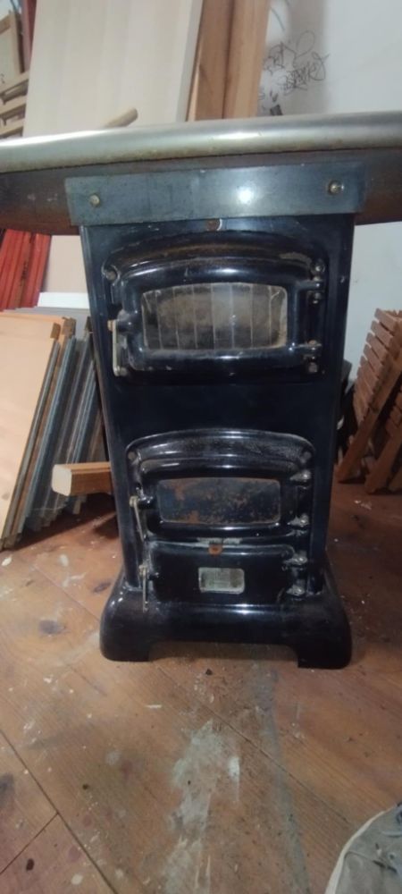 Vieux oil à bois avec zone cuisson , il manque une partie des pierres réfractaire à combler avec du ciment réfractaire. la base et le départ de tuyau est fournie. Pour restauration.