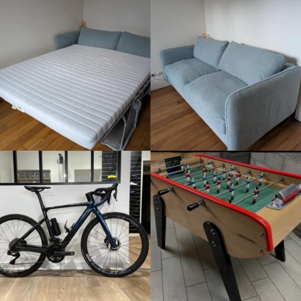 Suite à un voyage qui est entrain de durer plutôt que prévu, nous devons libérer une maison. Un vélo, un babyfoot et canapé lit restent à récupérer rapidement, car un proche n’a pas pu tout emporter et ça manque de place chez lui. Premier arrivé premier servi pas de réservation
